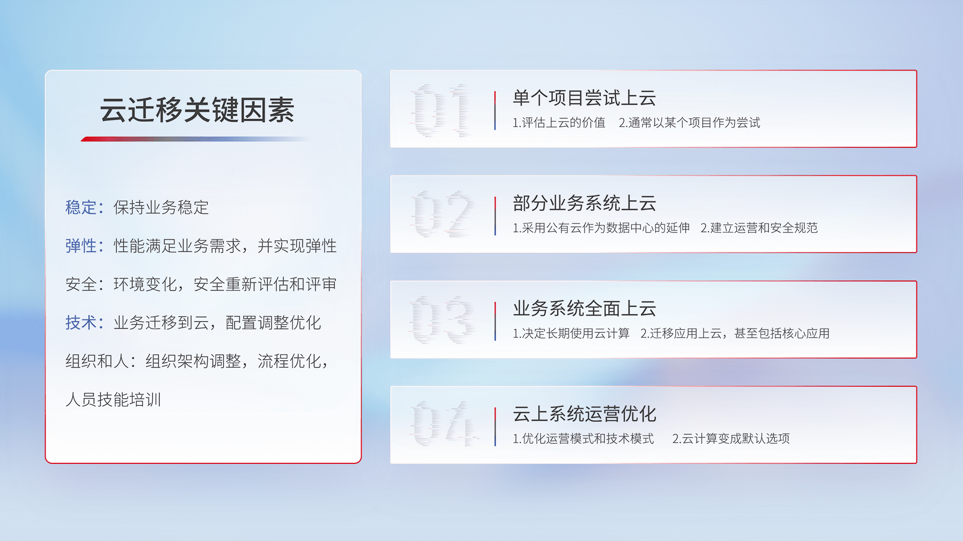 结合实际业务,,,从规划设计、、云平台选型、、云原生改造、、、、数据迁移、、、集成交付,,,,迁移全过程为客户识别最佳上云路径,,,,做好风险识别管理,,,,设计网络架构、、、身份权限、、、安全审计合规、、、操作审计、、、、日志审计、、、、监控告警策略、、、、多站点容灾设计等,,,对云上基础设施进行整体规划,,,,提升IT治理水平,,,以满足弹性、、、高可用、、、、高性能的需求。。。。