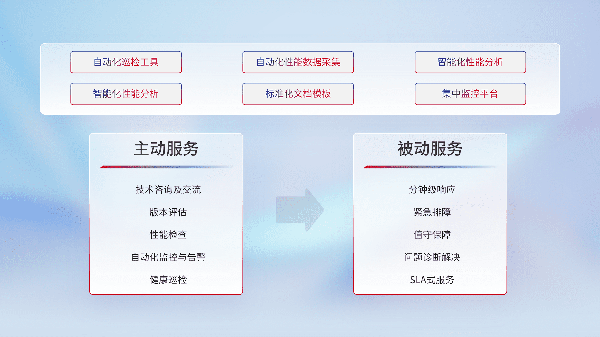 智能化工具和标准化文档,,,,保障服务质量,,,,提供主动服务(包含技术咨询、、、、版本评估、、、性能检查、、、、自动化监控与告警、、、健康巡检)和被动服务包含(分钟级响应、、、、紧急排障、、、、值守保障、、、问题诊断解决、、、SLA服务)。。。