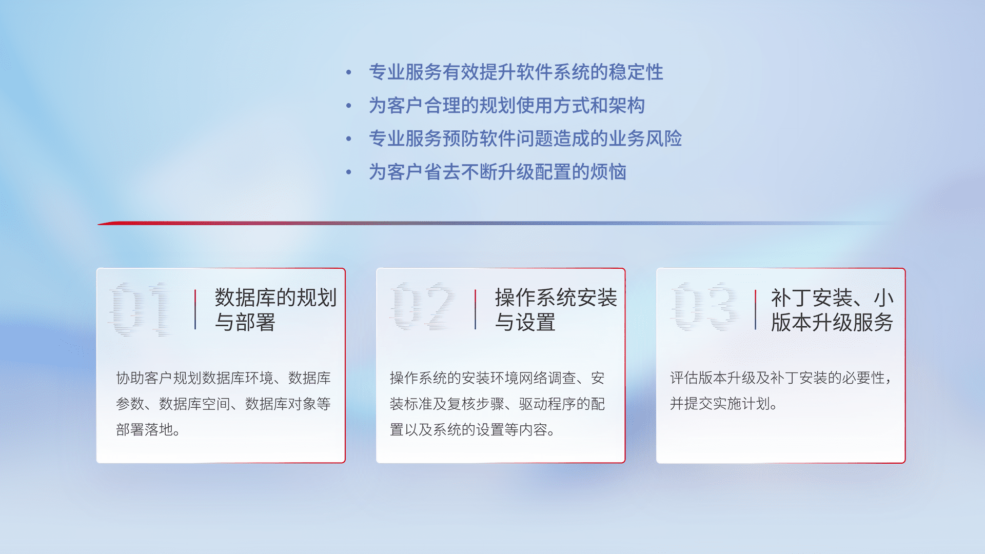 为客户提供软件规模升级、、、快速部署、、、按需配置的专业服务,,,从数据库的规划与部署到操作系统的安装与设置,,,,再到补丁安装和小版本升级提供支持。。。