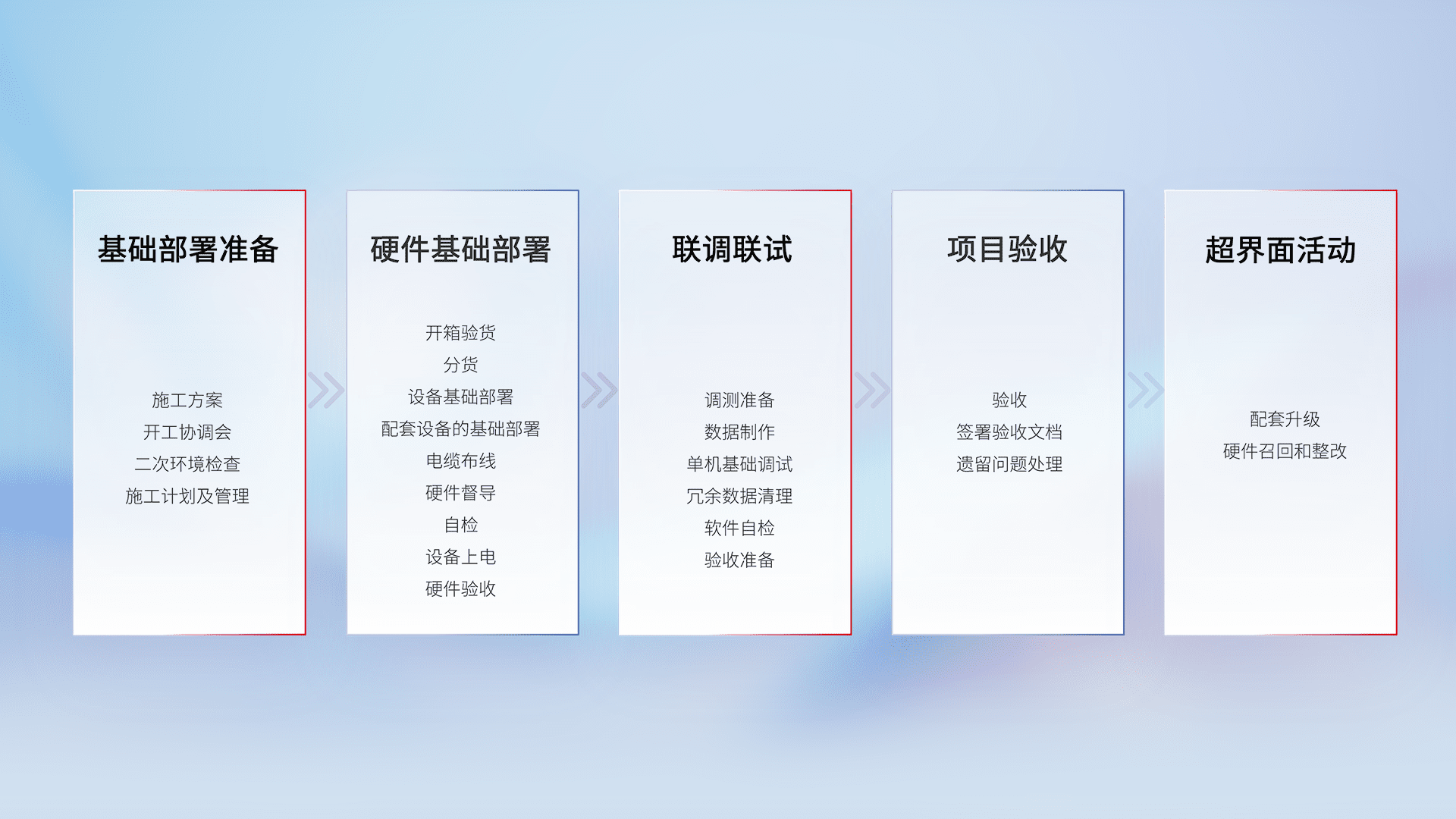 从基础部署准备、、硬件基础部署、、、、联调联试、、项目验收、、、越界面活动的全过程可追溯,,,,保证施工质量和进度。。